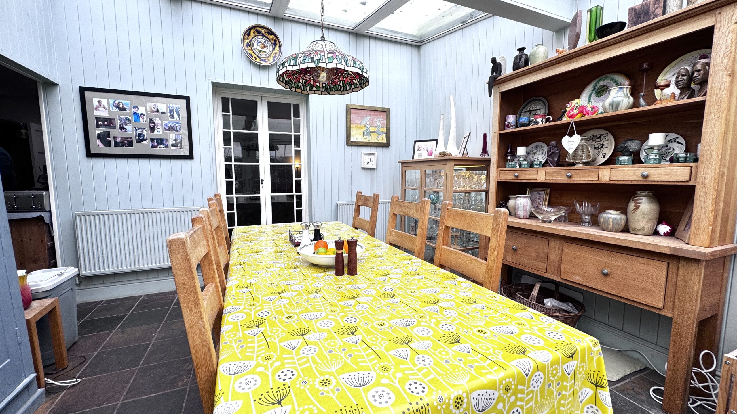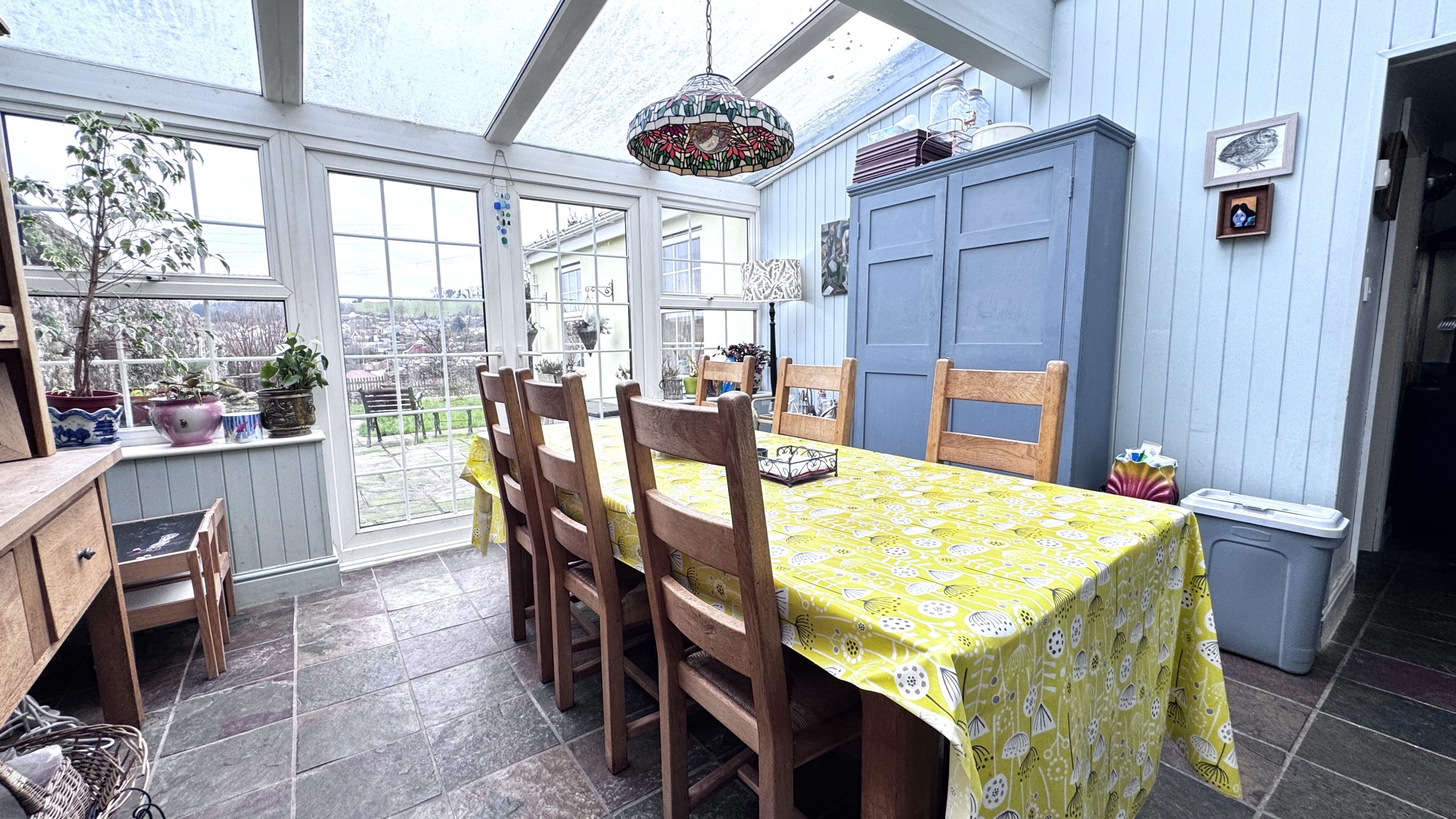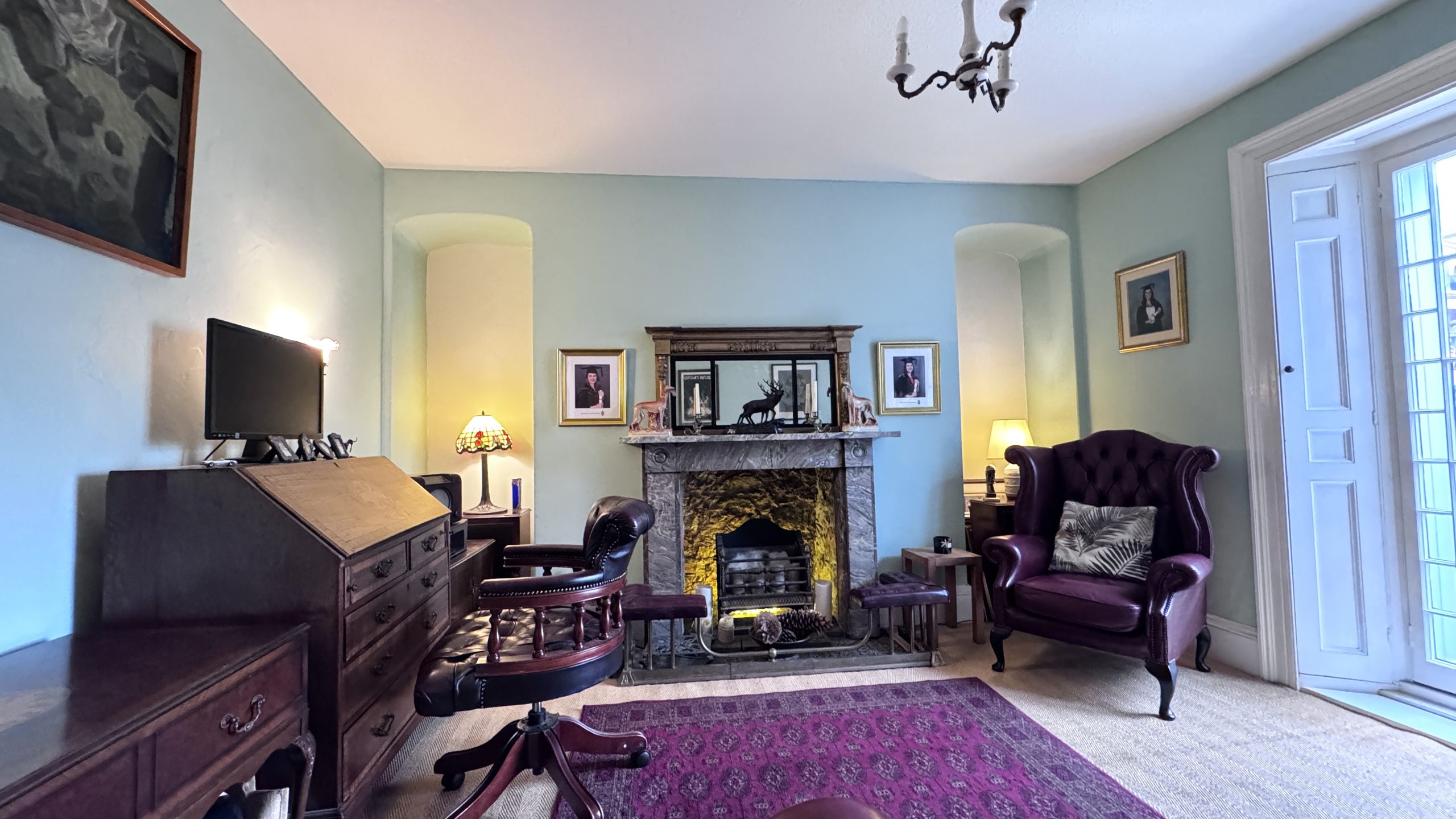 The ground floor provides excellent living and entertaining space and currently comprises a generous main lounge with a feature fireplace, creating a warm and inviting atmosphere. There is a further reception room, originally the formal dining room and now used as a study/home office or second lounge, which again benefits from an attractive feature fireplace and offers flexibility depending on a buyer’s needs. The kitchen is fitted with a combination of bespoke and freestanding solid pine units, complemented by granite worktops. Additional features include a floor-to-ceiling corner pantry/fridge, a traditional Belfast sink and a Range-style cooker, making the space both highly practical and full of period charm. Leading from the kitchen is a conservatory that is currently used as the dining room, providing a bright and airy space for family meals and entertaining while enjoying views across the surrounding area.