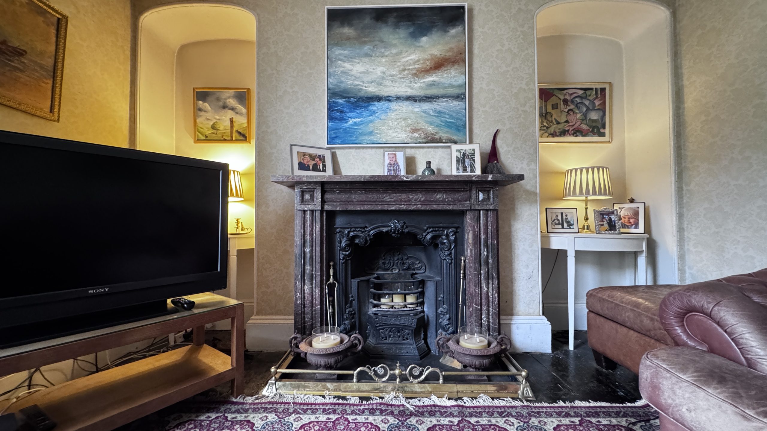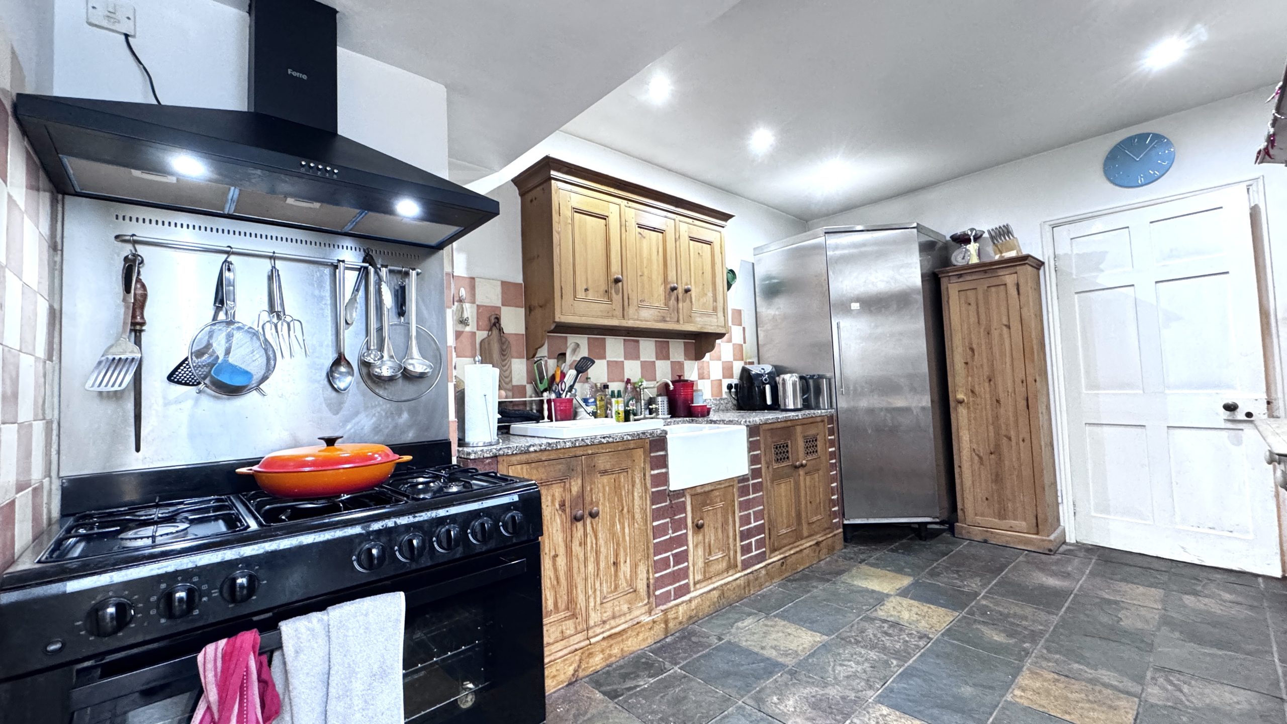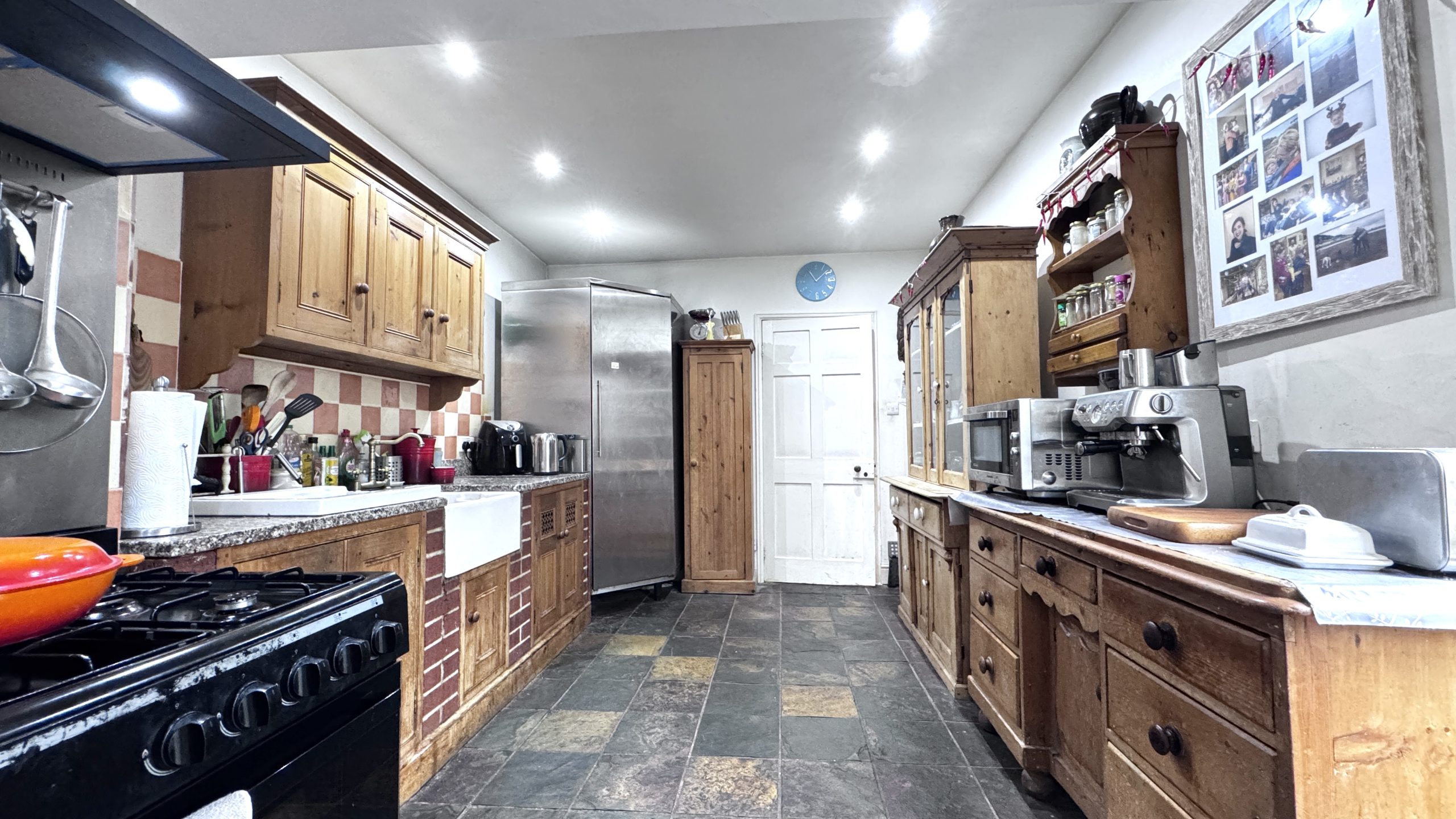 The ground floor provides excellent living and entertaining space and currently comprises a generous main lounge with a feature fireplace, creating a warm and inviting atmosphere. There is a further reception room, originally the formal dining room and now used as a study/home office or second lounge, which again benefits from an attractive feature fireplace and offers flexibility depending on a buyer’s needs. The kitchen is fitted with a combination of bespoke and freestanding solid pine units, complemented by granite worktops. Additional features include a floor-to-ceiling corner pantry/fridge, a traditional Belfast sink and a Range-style cooker, making the space both highly practical and full of period charm. Leading from the kitchen is a conservatory that is currently used as the dining room, providing a bright and airy space for family meals and entertaining while enjoying views across the surrounding area.