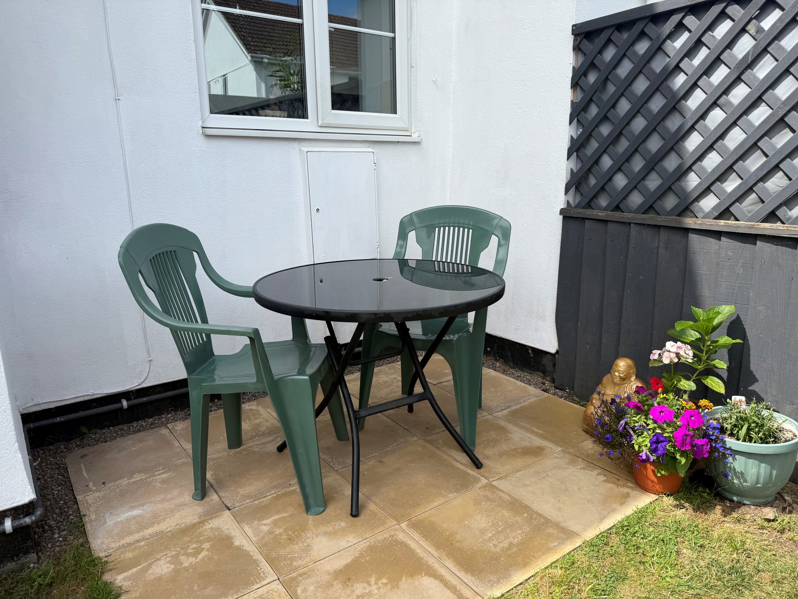 A covered porch with an external light leads to the front door, where you'll also find a handy outdoor cupboard housing the gas boiler for the central heating system.