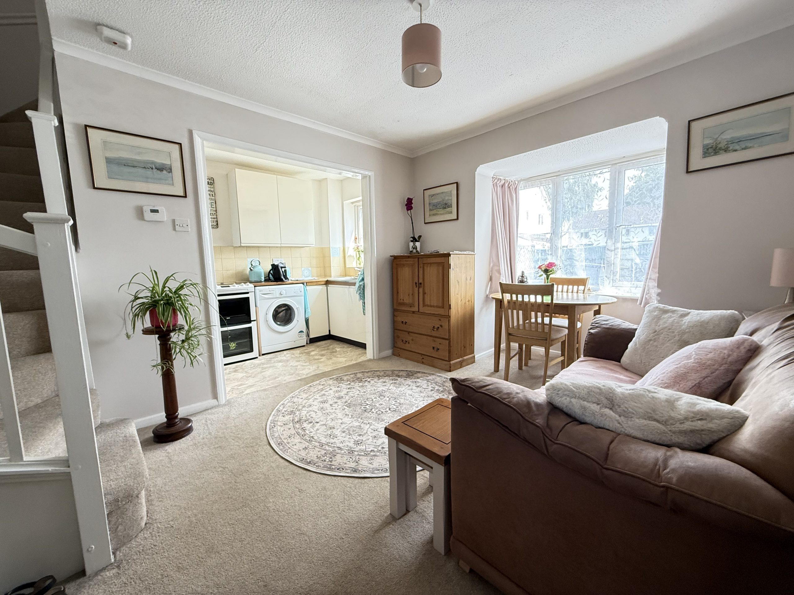 Step into an open-plan living space with a large uPVC double-glazed window overlooking the front garden. The kitchen flows from the living room and features a stainless-steel sink, laminate worktops, and a range of matching wall and base units. A freestanding electric oven is included, and there's an understairs cupboard for extra storage. A staircase leads to the first floor, providing access to the rest of the property.