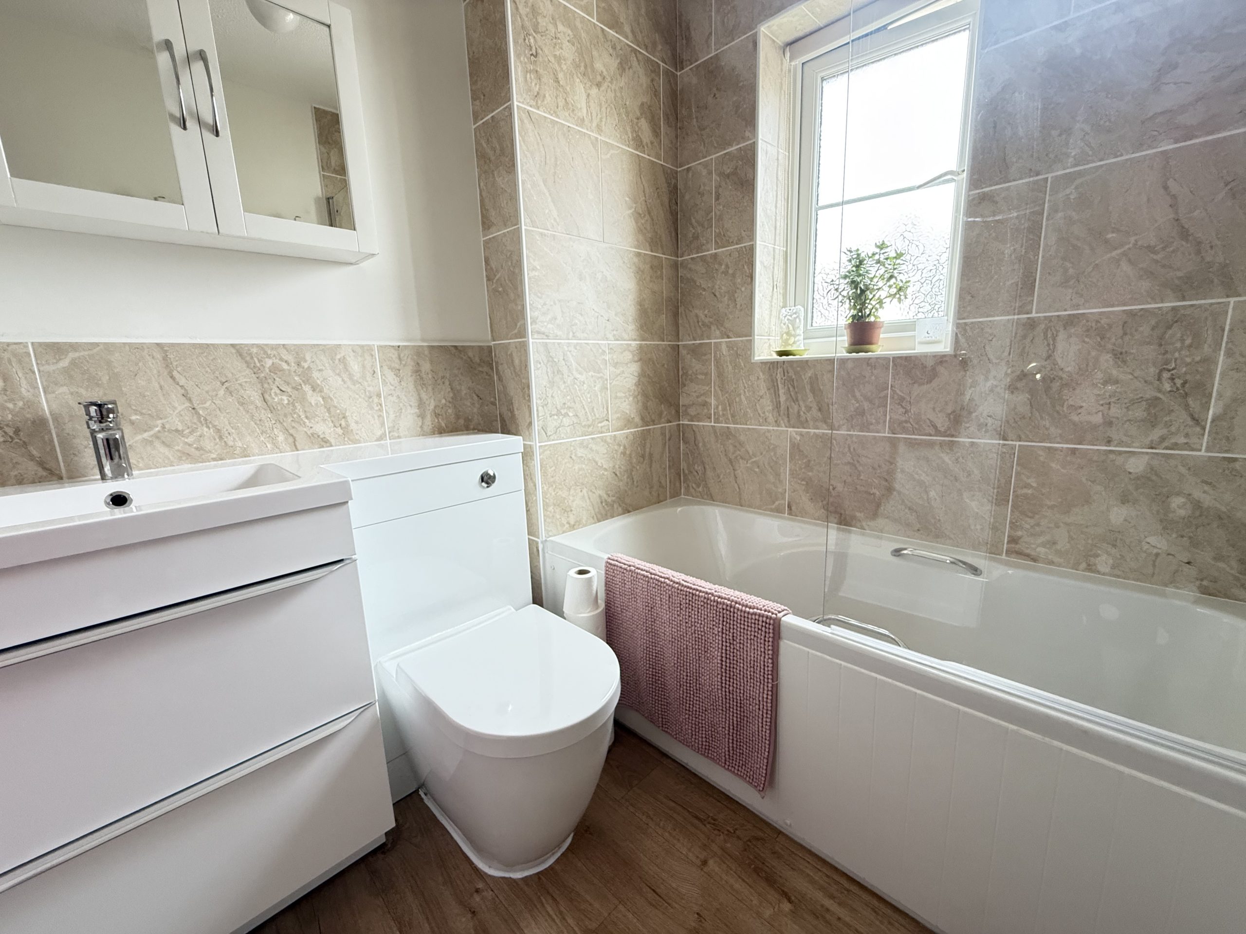 The bathroom includes a panelled bath with a shower over, a wash basin, WC, and a mirrored cabinet. A uPVC obscure-glazed window and part-tiled walls complete the space.