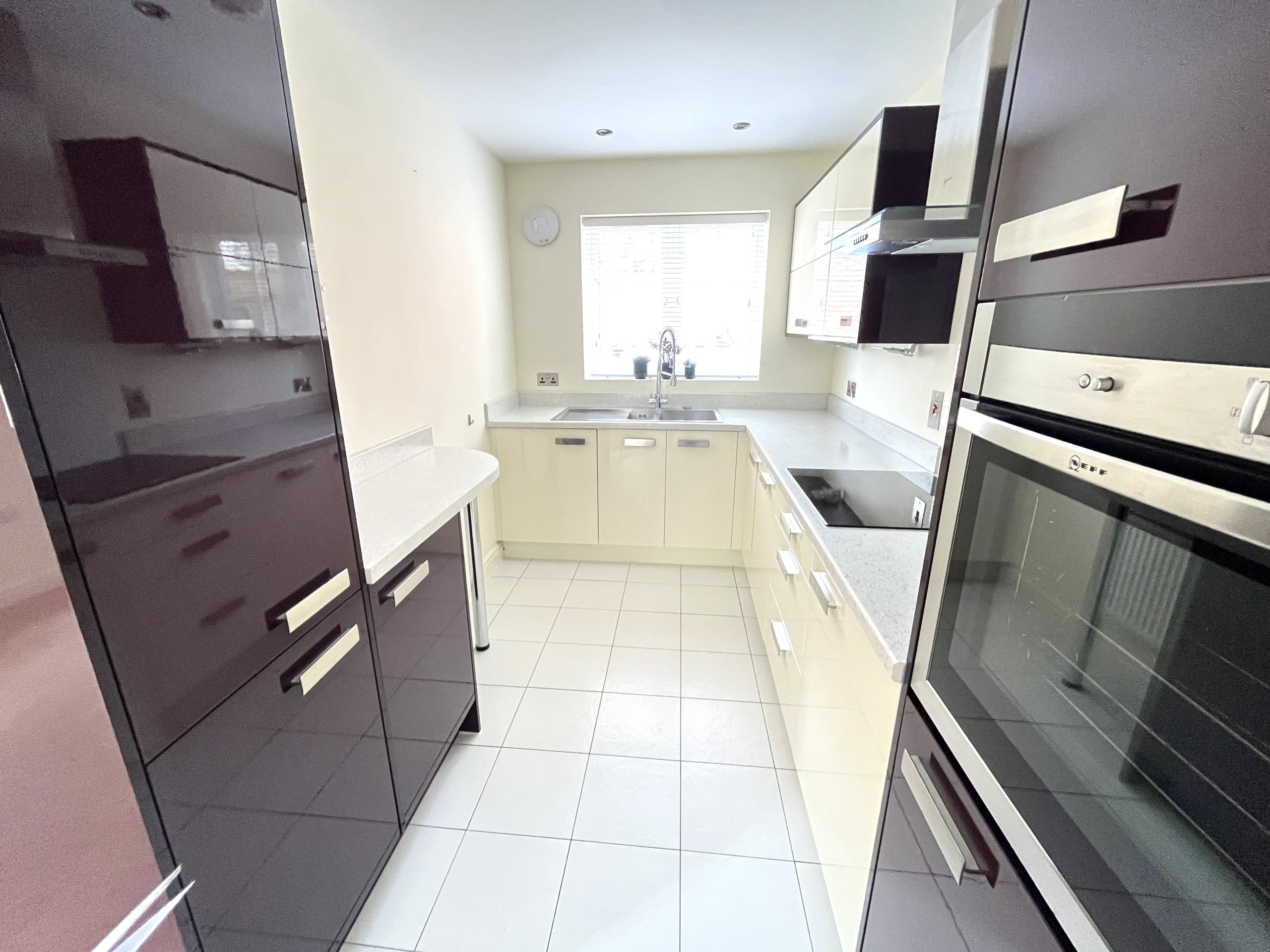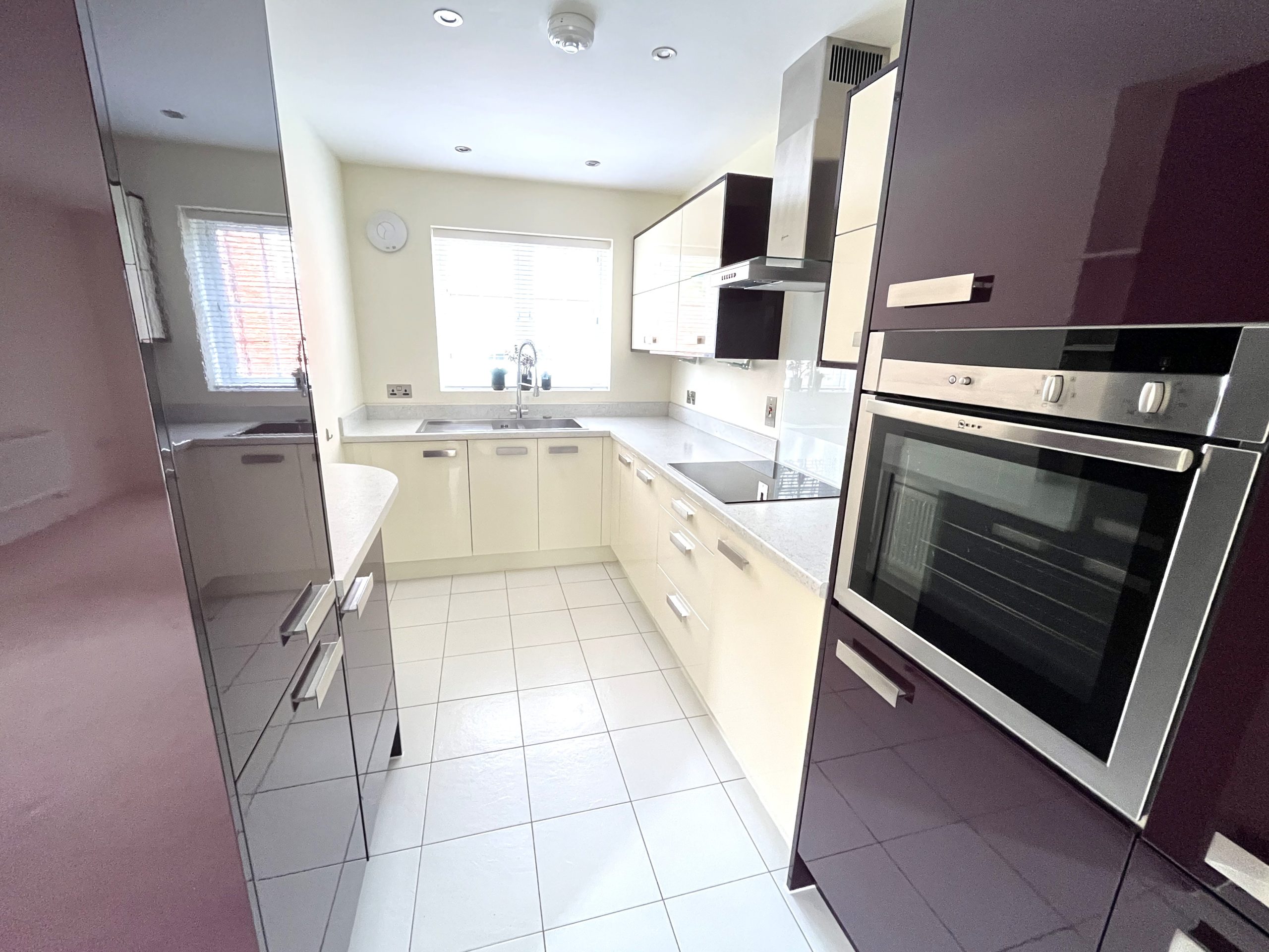 The living room has a feature flueless gas stove and oak spindled staircase to the first floor with an opening to the kitchen at the front and French doors to the conservatory at the rear. The kitchen is modern and well equipped with cream gloss base and wall units, complimented by contrasting high gloss burgundy cupboards. There are integrated appliances including fridge/freezer, washing machine, slimline dishwasher, electric hob with stainless steel extractor hood over and eye level electric oven.
