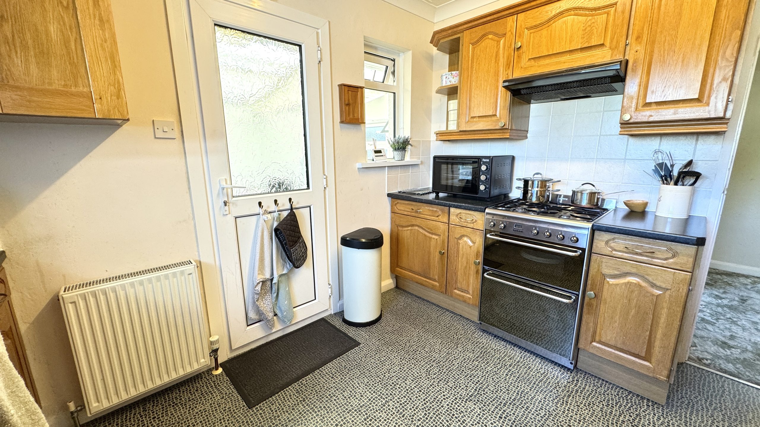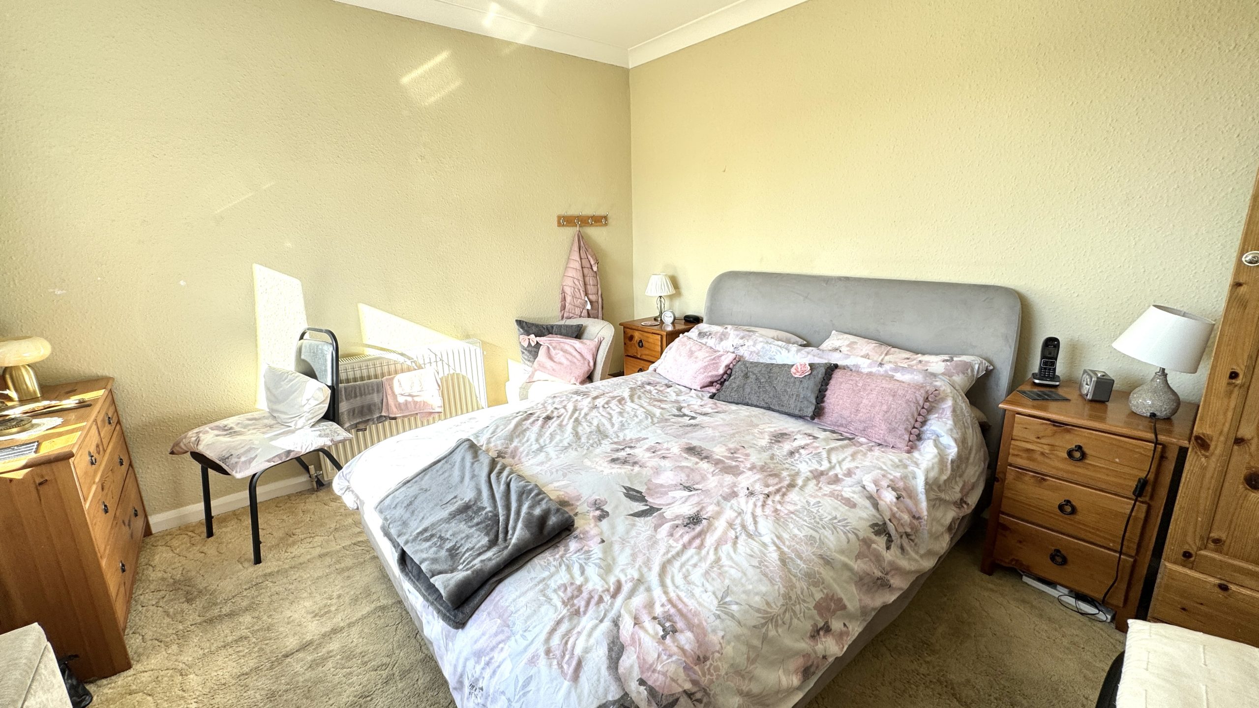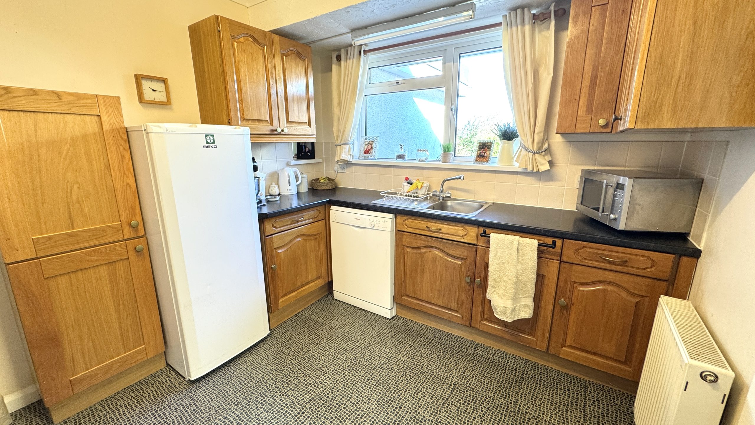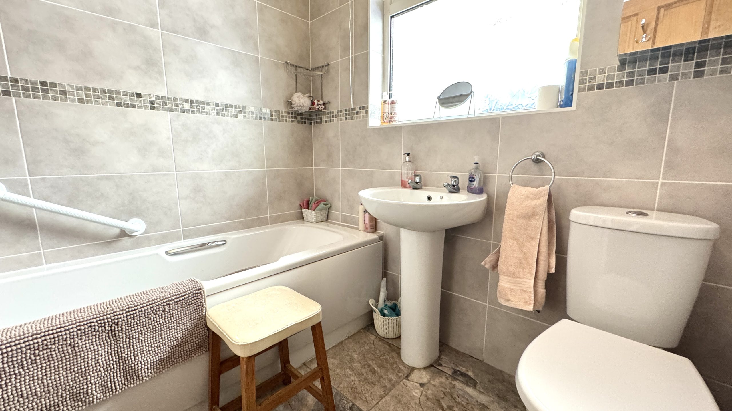 The bungalow offers three bedrooms – two generous doubles with front-facing windows, plus a versatile third room, ideal as a single bedroom, home office, or study. The bathroom is fitted with a panelled bath and shower over, a pedestal wash basin, a low-level WC, and is finished with full tiling.