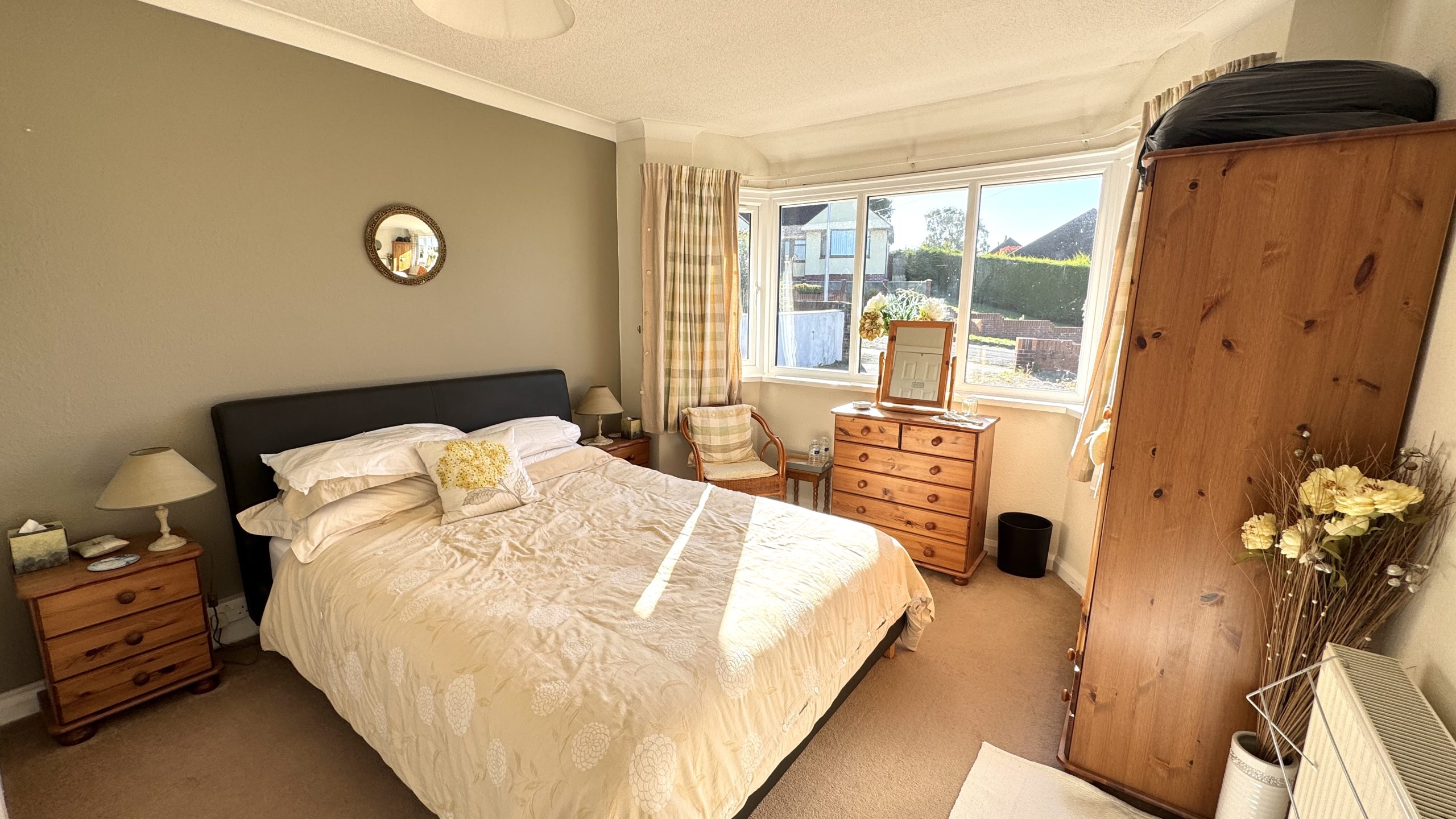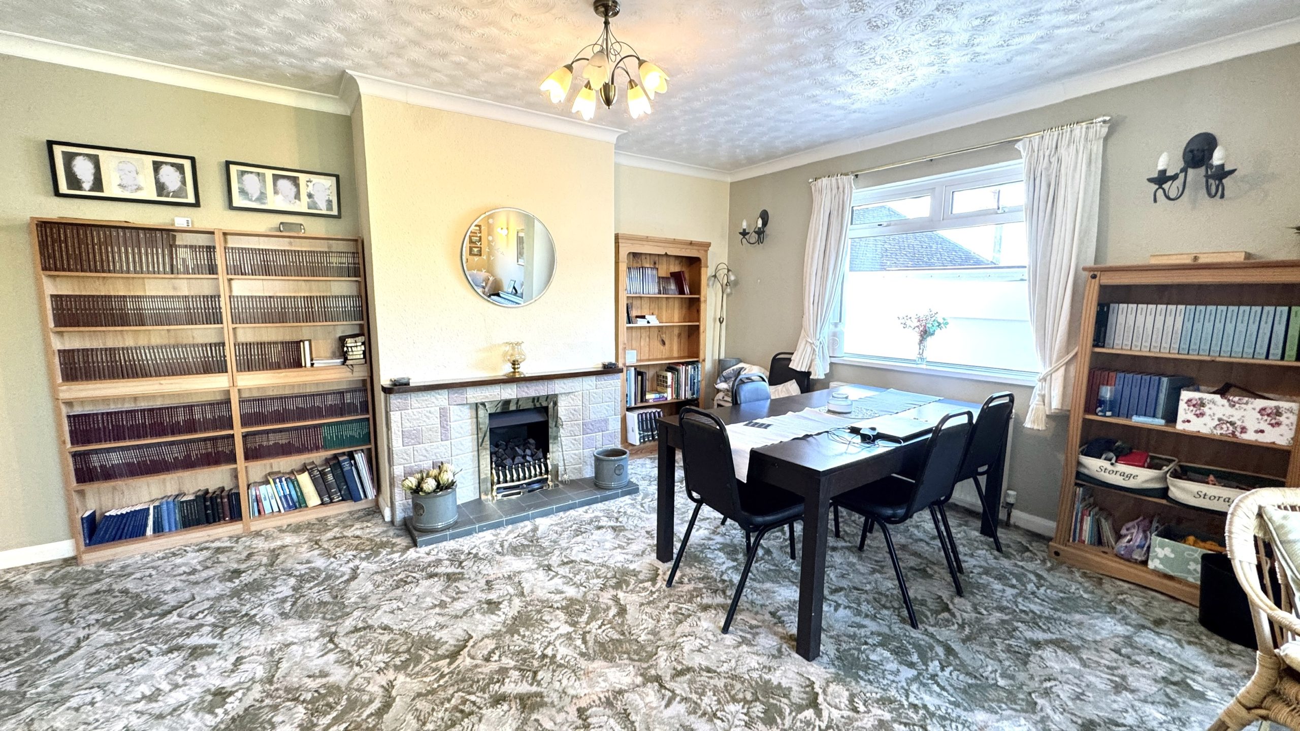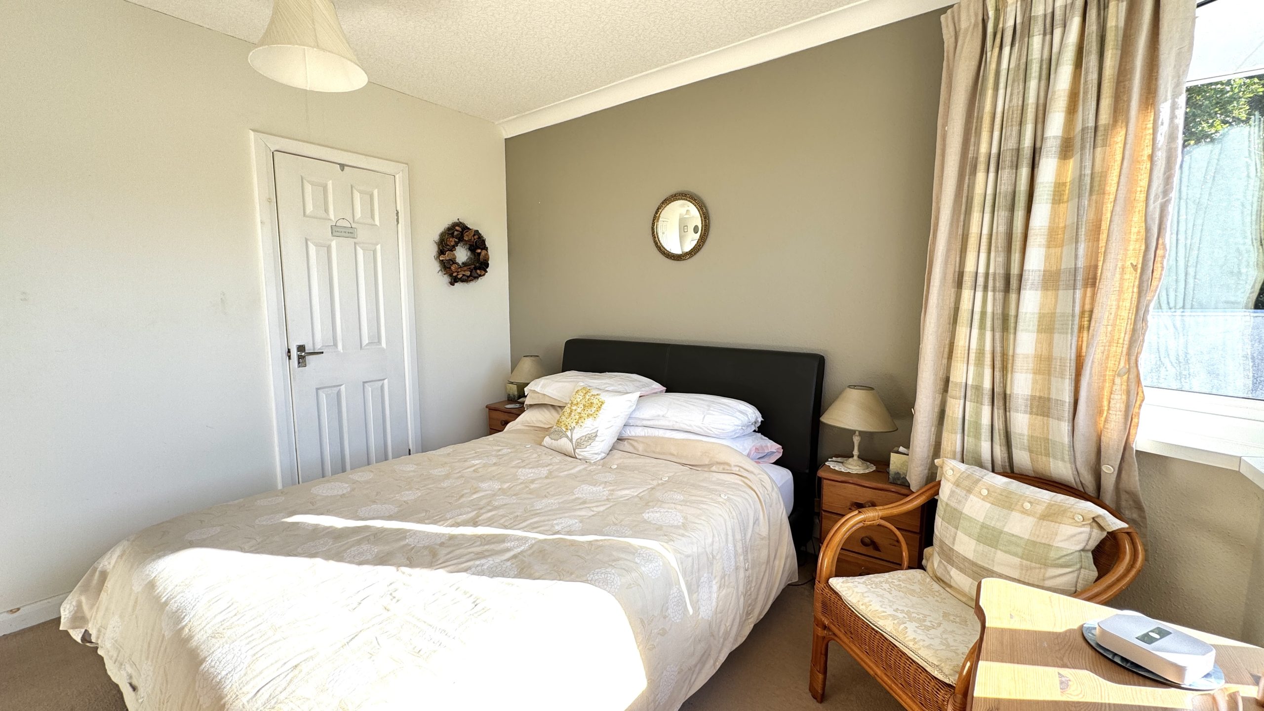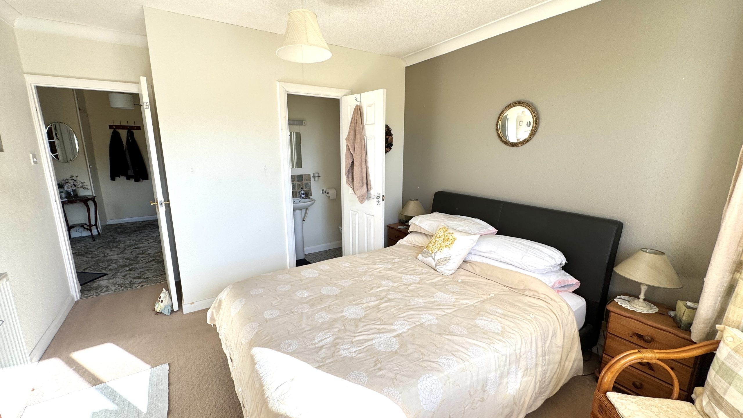 The bungalow offers three bedrooms – two generous doubles with front-facing windows, plus a versatile third room, ideal as a single bedroom, home office, or study. The bathroom is fitted with a panelled bath and shower over, a pedestal wash basin, a low-level WC, and is finished with full tiling.