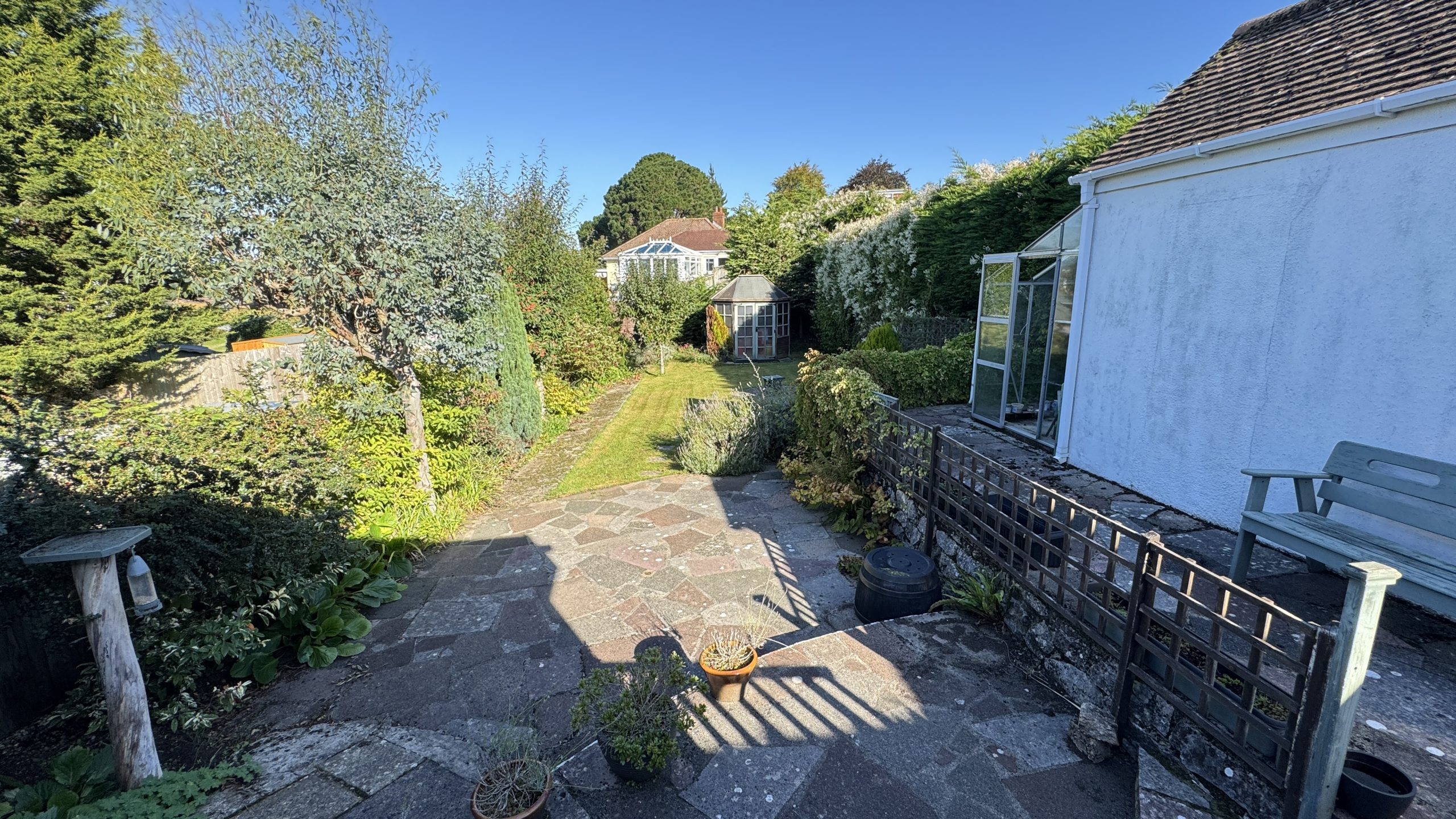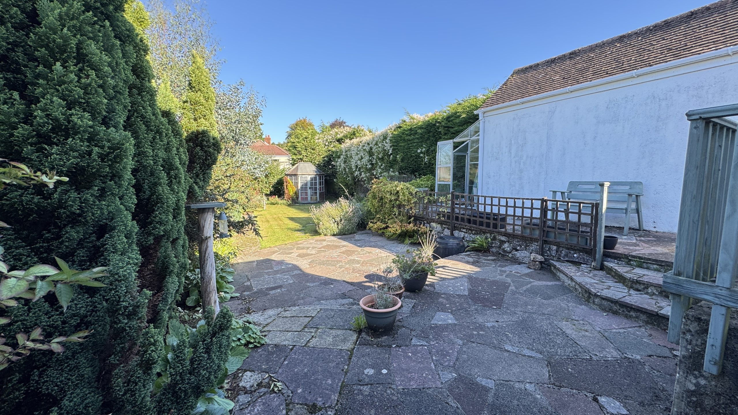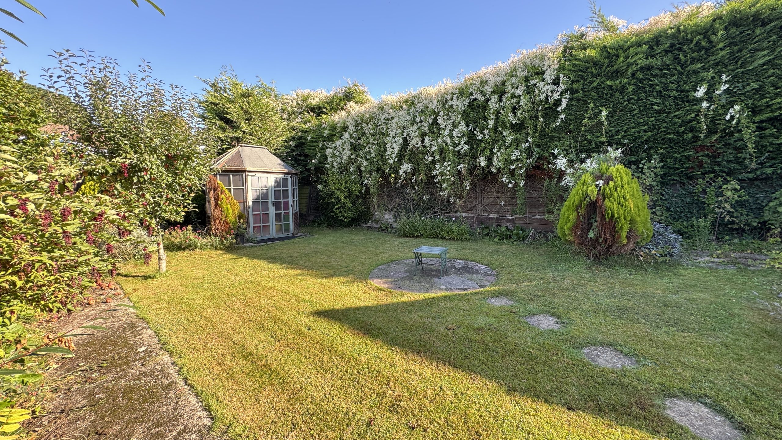 One of the property’s highlights is its gardens. To the rear, a spacious south-west facing sun patio leads onto a level lawn with central paved detail, attractively bordered by flowering shrubs and conifer trees. A cedarwood summerhouse provides an additional retreat, perfect for relaxing or entertaining. The front garden is equally well-maintained, with a lawn and decorative planting.