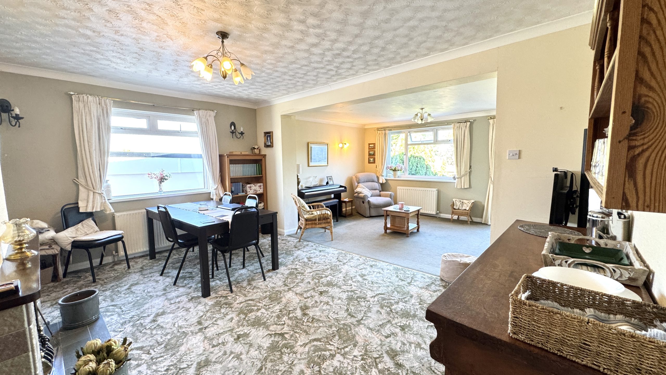 Inside, a spacious reception hall gives access to all rooms. The open-plan lounge/dining room is a bright and welcoming space, featuring a gas fire with a feature fireplace and large windows that frame attractive views across the rear garden. The kitchen is fitted with matching oak units and includes a gas cooker with hob and extractor, stainless-steel sink, and space for a dishwasher. A rear door leads into the utility room, which is plumbed for a washing machine and provides additional space for a tumble dryer and under-counter fridge/freezer. From here, a door opens directly onto the garden, where the same lovely outlook can be enjoyed.