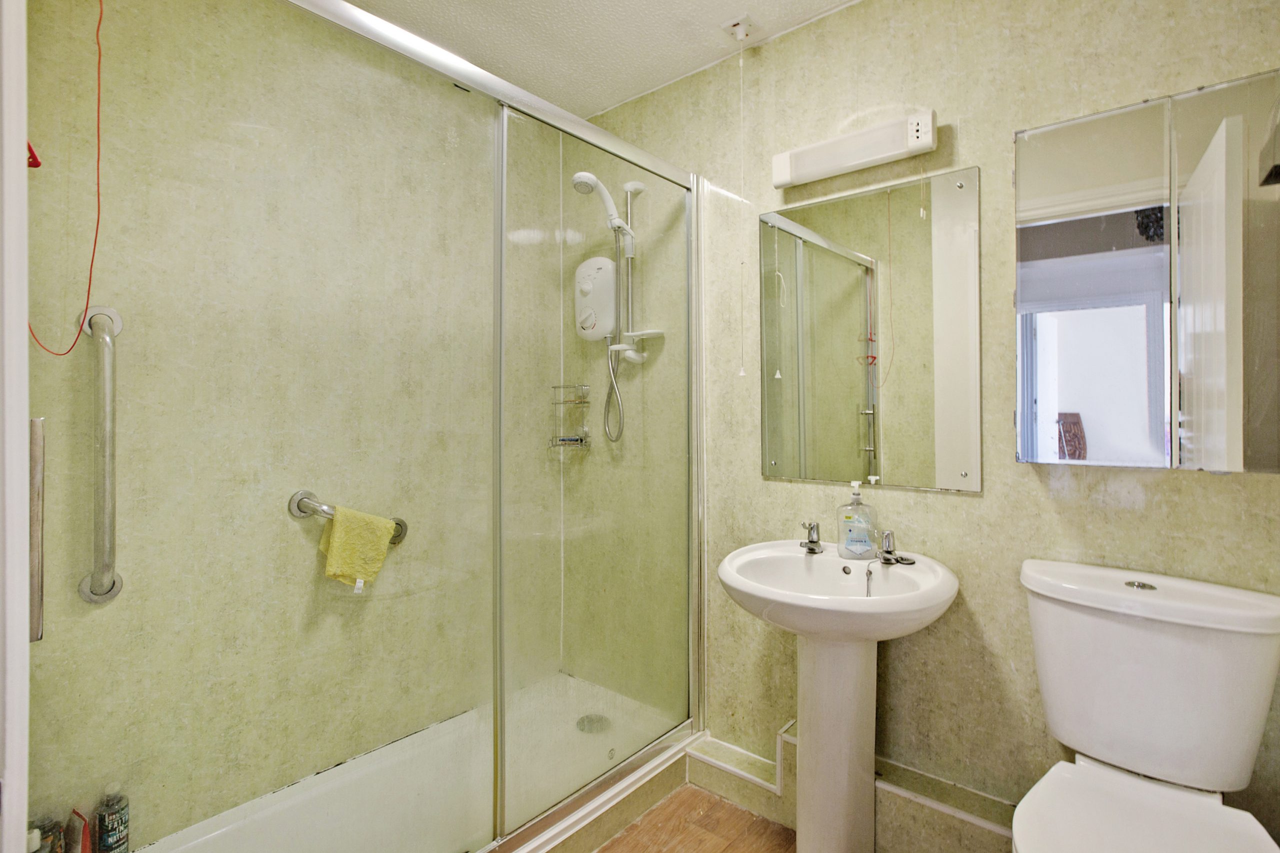 The shower room comprises a large shower area, pedestal wash hand basin, light and shaver point, low level WC and electric heater.