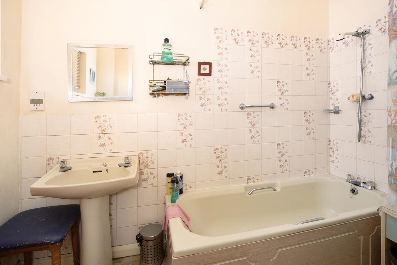 The family bathroom comprises bath, pedestal wash hand basin, WC, shaver point and obscure glazed window.