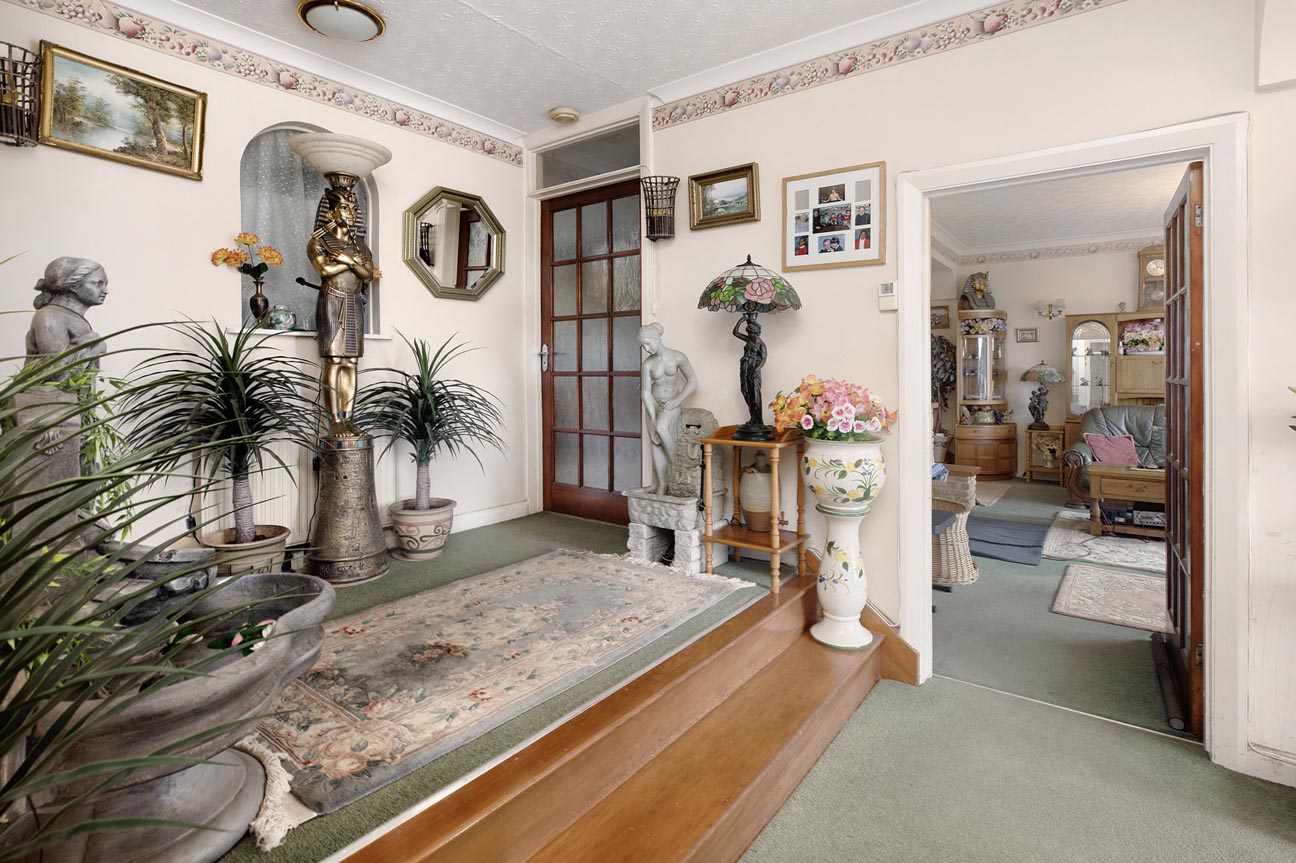 Stepping into the ‘L’ shaped entrance hallway there are two useful storage cupboards, one of which houses the hot water cylinder. Doors lead off to the principal rooms with two steps onto an area of raised floor which accesses two bedrooms, the kitchen and the loft space.